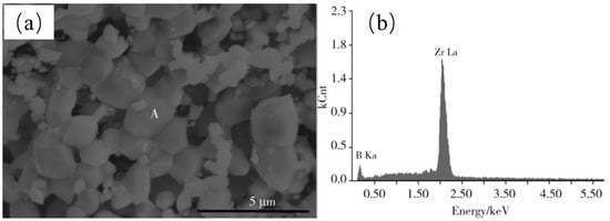 FESEM image of ZrB2 powders (a) and EDS of point A (b) [].