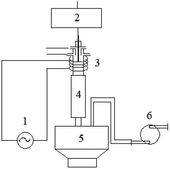 Layout of the RF thermal plasma processing system: (1) plasma power supply system, (2) entrained-flow powder feeder, (3) plasma torch, (4) cylindrical reactor and cooling chamber, (5) powder collector, (6) vacuum pump and exhaust system [].