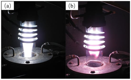 Thermal plasma synthesis is the most efficient technique for producing metal and ceramic nanopowders in continuous and scalable way [,,,,,,]. In addition to the characteristics of high temperature, high energy density, and the fast cooling rate of a thermal plasma, radio frequency (RF) induction plasma has no electrode pollution and provides a controllable atmosphere [,]. Figure 9 shows the layout of the RF thermal plasma processing system and Figure 10 shows pictures of Ar-plasma and H-plasma jets [].