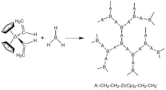 Wang H. reported a polymer precursor-derived method for the synthesis of ZrC/ZrB2 composite powders []. The precursor polymer called PZCB that was prepared using Cp2Zr(CHCH2)2 and borane, providing elements B and Zr for subsequent carbothermal synthesis. The formation of precursor polymer is shown in Scheme 3.