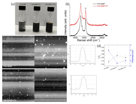 (a) Photographs of FA/CaCl2 dispersions of GNPs with concentrations of 0 (FA+GNP), 1 (FA+GNP+T1) and 10 (FA+GNP+T10) wt% of tannin, respectively. (b) Raman spectra of FA+GNP and FA+GNP+T1 dispersions. (c) AFM images (5 µm × 5 µm on the left and 3 µm × 3 µm on the right) showing the topographic view and height profiles of GNPs on silicon obtained from FA+GNP (top) and FA+GNP+T1 (bottom) dispersions after centrifugation, respectively. (d) ID/IG ratio values and flake thickness obtained from Raman and AFM analyses on the prepared solutions.