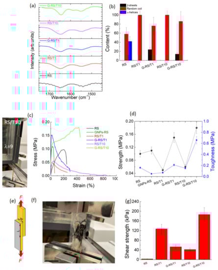 For evaluating the practicability of the RS/T and G-RS/T composites as stretchable materials, the mechanical properties were evaluated in detail (Figure 2c). The synergistic effect of the addition of both tannin and graphene for the RS composite is illustrated in Figure 2d. As a result, the mechanical properties of the G-RS/T10 sample are improved, with the highest tensile strength of 0.18 MPa, toughness (calculated as the area under the engineering stress-strain curve) of 0.66 MPa and elongation at break of 430%, respectively. Additionally, the mechanical properties of the RS added with different tannin concentrations (i.e., 1 wt% and 10 wt%) were also investigated and indicate that tannin addition also has a large effect on the mechanical performance. Compared with neat RS, we observed a decrease in the tensile strength and an increase in the elongation at break. These mechanical properties can be explained as follows: the molecules of tannin hinder the secondary bonding between the protein chains (intra- and inter-molecular), establishing a stable complex through non-covalent bonds [34]. This new arrangement facilitates the sliding of the molecules so that the tensile strength reduces while the elongation increases.