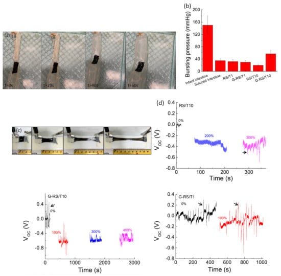 The sealant properties of the prepared samples were determined measuring the burst pressure. A 5 mm-long incision was made through one porcine intestinal wall. RS/T and G-RS/T sealants were positioned and gently pressed over the incision. A Porcine intestine loop was sectioned with a scalpel. The two loop cuts created were then anastomosed with 5/0 absorbable interrupted full thickness sutures; the suture used was synthetic absorbable monofilament made from the polyester (p-dioxanone) [21]. A digital manometer was connected in series to a pump, recording the burst pressure, which is defined as the maximum pressure reached before its sharp loss after the rupture. The piezoelectric properties were investigated as follows: the RS/T and G-RS/T samples were stuck onto the bottom of an aluminum tape electrode, and then aluminum tape was attached to the top. The samples were then positioned over a Teflon substrate to electrically isolate the system. The samples were progressively stretched and the open circuit voltage values were monitored using a computer-controlled Keithley 4200 Source Meter Unit (Tektronix UK Ltd., The Capitol Building, Oldbury, UK). The dynamic piezoelectric output of the samples was measured by using the finger imparting method reported elsewhere [22].