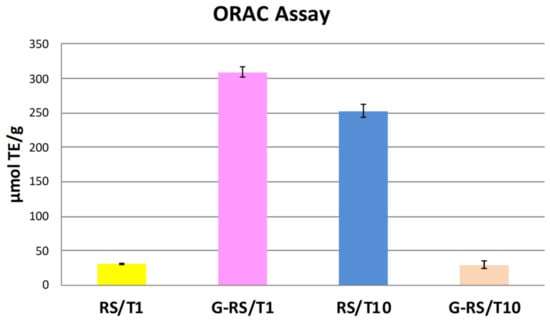 Envisioning a biomedical application, antioxidant capacity was initially investigated due to the tannin presence in both the RS/T compounds (1 wt% or 10 wt%) and in the G-RS/T composites. The tannin extract alone shows, as expected, a great antioxidant property: 20,268.25 ± 521.55 μmolTE/g (data not shown). The RS/T1 compound, reported in Figure 4, has approximately 30 μmolTE/g, whereas RS/T10 exhibits an ORAC value about eight times greater, i.e., 252 μmolTE/g. We ascribe this result to a higher tannin content. The most interesting result is the antioxidant capacity of G-RS/T1, which displays the highest ORAC value of all four compounds: 308 μmolTE/g. It is likely that the antioxidant activity is amplified by the presence of graphene [42,43]. On the contrary, the low ORAC value obtained for G-RS/T10 is due to the partial insoluble nature of this compound in the hydrophilic buffer, which could underestimate the result.