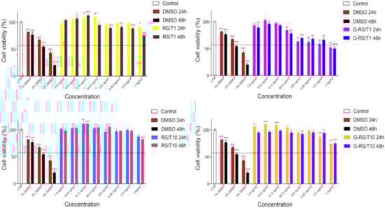 Safety evaluation of the RS/T and G-RS/T samples tested in vitro using MTT test. HepG2 cells were in vitro treated with six scalar concentrations for 24 h and 48 h. The percentage of viable cells with respect to the control was reported as the mean standard deviation of three independent experiments, each conducted in triplicate. Positive controls were obtained with DMSO 1%, 2% and 4%. Values were represented as mean ± standard deviation and were compared with one-way ANOVA with p ≤ 0.05 considered statistically significant; * p < 0.01, ** p < 0.001 and *** p < 0.0001.