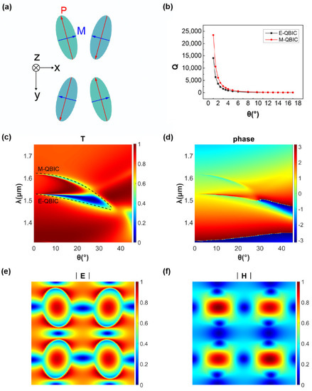 For the general case, we assume that the incident field is linear polarized light, electrically polarized in the x direction and magnetically polarized in the y direction. On account of the symmetry of the structure, the plane wave is coupled to the collective mode with net polarization (Px, My) after incidence. As shown in Figure 2a, when the inclination angle θ and height difference D are both small, the primary polarization in the zigzag metasurface is perpendicular to the incident field; that is, the dominant electrical polarization is along the Y-axis and the dominant magnetic polarization is along the X-axis (Pn,y ≫ Pn,x, Mn,x ≫ Mn,y). However, due to the antisymmetric distribution of the elliptical cylinders, the dominant polarization component in the unit of the structure is cancelled out internally: , . Therefore, the out-of-plane coupling between the dominant polarization and the plane wave with incident electric and magnetic polarizations along the y- and x-axes, respectively, is prevented, which greatly reduces the radiation loss of the structure. When θ = 0 and D = 0, the whole structure is symmetrically protected and presents perfect BICs. When the asymmetric parameters (referring to the inclination angle θ and height difference D, here) approach zero but do not equal zero, the two kinds of net polarizations Q-BICs are the so-called electric quasi-BICs (E-QBIC) and magnetic quasi-BICs (M-QBIC).
