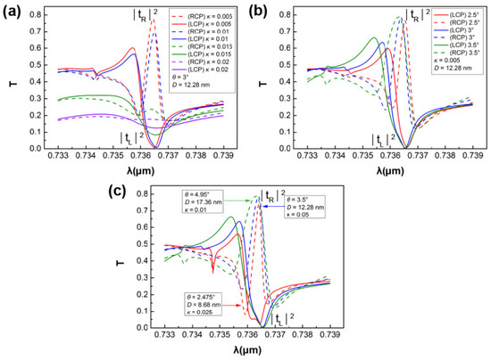 As shown in Figure 6a, setting θ = 3° and, correspondingly, D = 12.28 nm, we simulated the comparison diagram of the transmission of LCP and RCP light with different extinction coefficients κ. It was found that, when κ = 0.005, the maximum chirality was achieved. In addition, it can be seen that, at a slightly shorter wavelength, there was another resonance peak with low peak and broad line width, which is relative to magnetic-dipole resonance. Under the premise that other parameters are fixed—namely, D = 12.28 nm and κ = 0.005—the transmission spectra of the structure at different angles were simulated. The results are shown in Figure 6b, from which it can be observed that a better maximum circular dichroism could be achieved at θ = 3.5° than that at θ = 3°; that is, the uncoupling of the eigenstates from incident waves is ideal when θ = 3.5°. It was found that, on the basis of our theoretical calculations, the slight misalignment of the rod shape and the dipole moments results in a slight mismatch. From θ = kD/2 = πD/λ and Equation (14), we can obtain the general condition for achieving the maximum chirality: . To verify this rule, we simulated the transmission spectrum at κ = 0.0025 and κ = 0.001, as shown in Figure 6c.