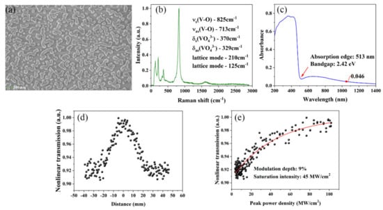 (a) The TEM image. (b) The Raman spectrum. (c) Absorptance of the Mo:BiVO4 film. (d) Z-scan curve of Mo:BiVO4-SA. (e) The dependence of nonlinear transmission on peak power density.