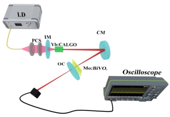 The draft of the continuous wave (CW) and pulsed Yb:CALGO laser is shown in Figure 2. The pump light is a 976 nm laser diode array with a maximum output power of 30 W and a core diameter of 100 μm. It is focused onto a Yb:CALGO crystal through a 1:1 collimating coupler. The dimension of a-cut Yb:CALGO (3 at.%) is 4 × 4 × 8 mm3. Both end surfaces of Yb:CALGO are antireflection-coated (R < 1%) at the 976 nm and 1030–1080 nm. A V-type laser cavity is utilized to research the pulsed laser. Both sides of the input mirror (IM) are antireflection-coated at 976 nm (R < 1%) and the right side is high reflectively (HR) coated (R > 99%) at 1030–1080 nm. The CM is a concave mirror whose curvature radius is 100 mm, and it is HR coated in the band 1030–1080 nm. As for the output coupler (OC), two plane mirrors with different transmissions of 1% and 2% at 1030–1080 nm are utilized, respectively. By calculation, the beam radii in the laser crystal and Mo:BiVO4-SA are 106 μm and 96 μm, according to the ABCD propagation matrix.