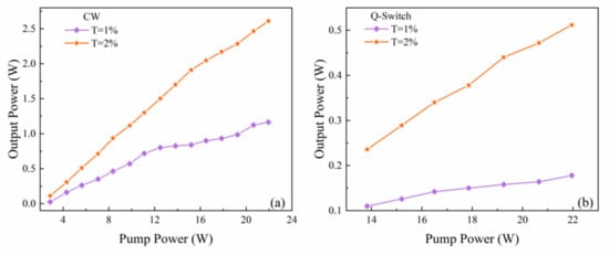 The resonator firstly operated at CW state without SA, and two types of OCs were used for comparison in a similar experimental setup. The output power reached the peak 1.17 W with a slope efficiency of 5.7% when the transmission of OC is 1%. To improve the output power, the OC was replaced with another one with T = 2%. The resonator reached a maximum output power of 2.6 W, with a slope efficiency of 13.2%. The pump power did not exceed 22 W to prevent the laser crystal from damage risk. The performances of CW operation are demonstrated in Figure 3a. The Mo:BiVO4-SA was then inserted into the resonator and it was placed close to OC. The laser could stably operate at passively Q-switched state by carefully adjusting the SA under the pump power of 13.8 W. The cavity delivered the maximum output power of 178 mW and 510 mW when the pump power reached 22 W, corresponding to the OC of T = 1% and 2%, respectively. From the comparison of Figure 3a,b, one can see that the output power of pulsed laser decreases a lot more than CW operation. The main reason is that the insertion of Mo:BiVO4-SA results in more loss to the resonator.
