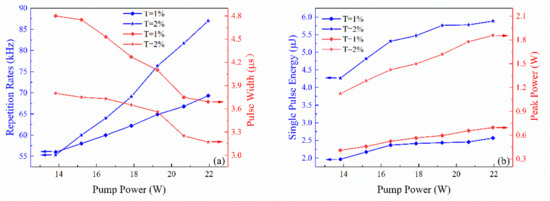 The dependence of repetition rate and pulse widths on pump power is shown in Figure 4. Both of them represent typical characteristics of a passively Q-switched laser: the repetition rate increases while the pulse width reduces when pump power increases. For T = 2% OC, when pump power reached 13.8 W, the pulse width was 3.83 μs with a repetition rate of 55 kHz. The pulse width reduced to minimum 3.18 μs while the pulse repetition rate increased to 87 kHz under the pump power of 22 W. For T = 1% OC, the pulse width reduced from 4.8 μs to 3.7 μs while the pulse repetition rate increased from 56 kHz to 69 kHz. The single pulse energy and peak power based on different transmissions of output couplers were calculated according to the experimental results, as shown in Figure 4b. The detailed data is shown in Table 1.