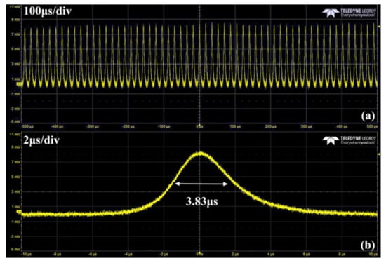 The pulse sequence (T = 2%) recorded at (a) 100 μs/div and (b) 2 μs/div.