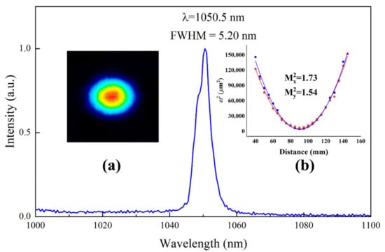 The beam profile was recorded by a CCD camera (Dataray, S-WCD-LCM-C-UV, CA, USA) when the laser was oscillating in Q-switched operation state, as shown in Figure 6a. The beam radii at different positions were measured and the M2 factors were fitted to be and (Figure 6b). The spectrum of the pulsed laser was measured by an optical spectrum analyzer (Avantes, AVASPEC-3648-USB2, Apeldoorn, Netherlands). The wavelength was 1050.5 nm and the full width at half maximum was 5.2 nm.