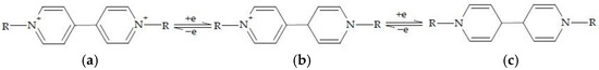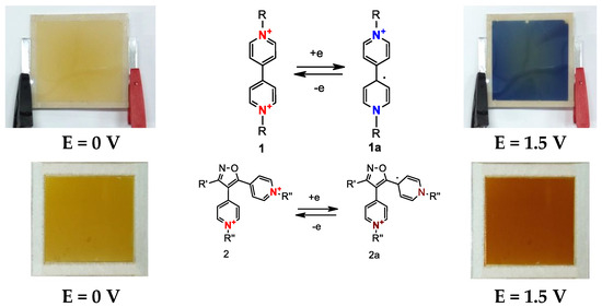 | CPQ2+ + e− + X−↔[CPQ+●X−] | Electrochromic paper, “Smart Window” | [39,40,41] |