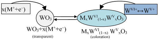- There are several hypotheses concerning the mechanism of electrochromism in WO3. Generally, the electrochromic effect in WO3 films can be described as an electrochemical cathodic polarization during which H+ ions are transferred from the electrolyte and an electron is transferred from the ITO electrode. As a result, WO3 film switches from a bleached to a colored state; its color varies from pale blue to dark blue and black. The conductivity of WO3 films is determined by the presence of cations (H+, Li+, etc.) and electrons. As already mentioned, the coloration mechanism in WO3 films has still been insufficiently investigated.