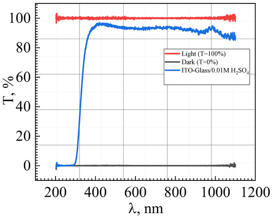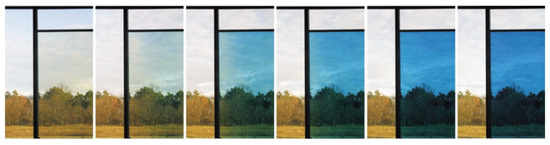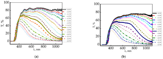 - Control of energy transfer in different environments, for example, filtering solar radiation using “Smart Window” devices [25,26,27]. Fast mode switching (colored/bleached) is not required, but the device should be capable of filtering both visible and near-infrared radiation. Moreover, the transparency of the window packages must be at least 70%.