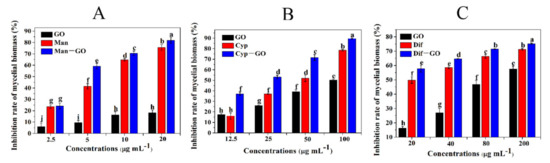 Inhibitory activities of GO, fungicides and GO–fungicides on the mycelial biomass of F. graminearum. The inhibition rate of mycelial biomass was tested at different concentrations of GO and Man–GO (A), Cyp–GO (B) and Dif–GO (C) for 120 h at 24 ± 2 °C. Error bars represent the standard error (N = 4). Different lowercase letters indicate significant differences between treatments (p < 0.05).
