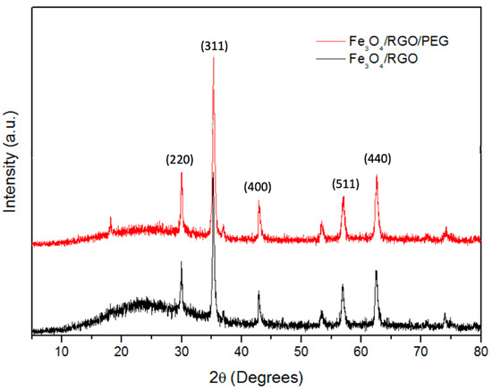 Comparative XRD analysis for Fe3O4 nanocomposites containing RGO and PEG.