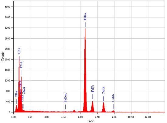 EDX spectrum of Fe3O4/RGO/PEG nanocomposite.