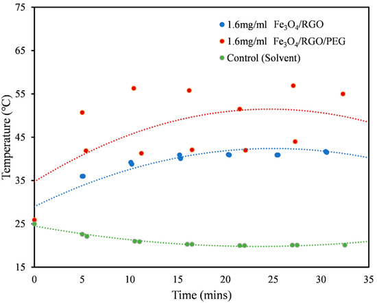 Heating profiles for 1.6 mg/mL solutions of Fe3O4/RGO (blue) and Fe3O4/RGO/PEG (red) along with the control (green) in aqueous DMSO medium at magnetic field of 200 A.