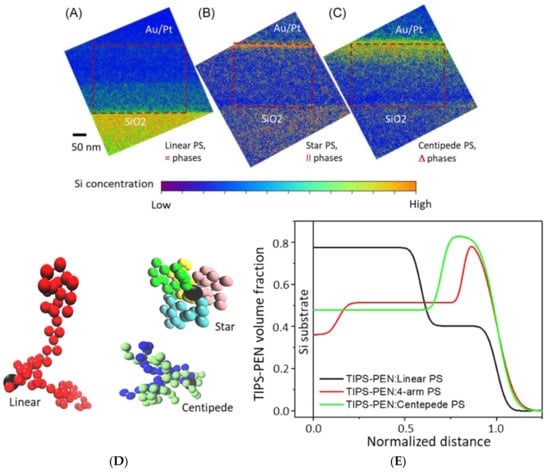 Cross-section EFTEM Si element mapping reveals through-thickness concentration profiles of Si-containing TIPS-PEN in blend films with various PS binders: (A) linear, (B) 4-arm star, and (C) centipede. The interface of each blend film with SiO2/Si is referred to as the bottom, while the top surface (also referred to as an air interface) is coated with Au/Pt. Images (A) and (C) clearly visualize vertical (=) and gradient (Δ) phase segregation, respectively, while mapping of a TIPS-PEN-rich domain in a lateral (II) star PS blend film (B) shows a high TIPS-PEN concentration at the top. EFTEM, energy-filtered transmission electron microscopy; PS, polystyrene; TIPS-PEN, 6,13-bis(triisopropylsilylethynyl)-pentacene. (D) Typical bead conformations of three PSs. The central beads are colored black in all three, while side chain beads are represented by different colors in the star and centipede models. (E) Volume fraction profiles of TIPS-PEN in blend films, calculated from neutron reflectivity. Distance from the substrate surface is normalized against film thickness. TIPS-PEN, 6,13-bis(triisopropylsilylethynyl)-pentacene. Reproduced from [10] under the terms of the Creative Commons CC BY license [18]. No changes have been made.