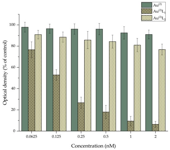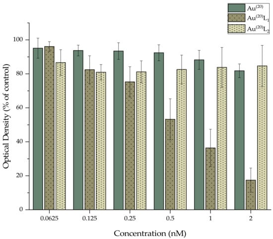 Cytotoxicity evaluation of bare AuNPs (namely Au(2) and Au(20)) and ligand-functionalized AuNPs (namely Au(2)L1, Au(2)L2, Au(20)L1, and Au(20)L2) was carried out using the MTT [3-(4,5 –dimethylthiazol-2-yl)-2,5-diphenyltetrazolium bromide] colorimetric assay. This method is based on the reduction of yellow MTT tetrazolium salt to purple formazan crystals by active cells in mitochondria and catalyzed by dehydrogenase enzymes. The formed purple formazan crystals can be solubilized and the absorbance of this purple solution can be quantified and determined by spectrophotometry at a certain wavelength. This transformation is only possible in viable cells, because dead cells are unable to metabolize MTT, thus leading to reduced absorbance. The metabolic activity of the cells is proportional to the color density of the purple formazan crystals. For these reasons, MTT assay can be used as an indicator for cell viability and cytotoxicity [31,32].
