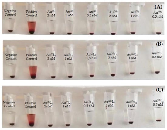 Hemolytic effect of: (A) Au(2) and Au(20), (B) Au(2)L1 and Au(20)L1, and (C) Au(2)L2 and Au(20)L2 at different tested concentrations (0.5 nM, 1 nM, and 2 nM). Positive control: 10 μL TRITON X 10% + 275 μL PBS + 15 μL of RBCs; negative control: 285 μL PBS +15 μL of RBCs.