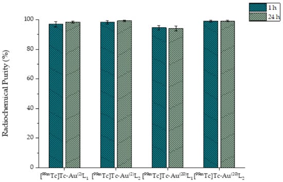 In vitro stability of [99mTc]Tc-Au(2)L1, [99mTc]Tc-Au(2)L2, [99mTc]Tc-Au(20)L1, and [99mTc]Tc-Au(20)L2 at 1 h and 24 h post-radiolabeling.