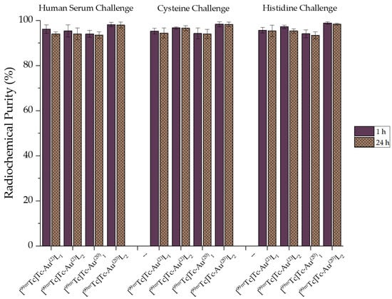 For cysteine–histidine stability assessment, 50 μL samples οf each of the radiolabeled complexes (100–300 μCi) were challenged against 450 μL οf cysteine and histidine solutions (0.02 M). Then, the samples were incubated at 37 °C for 1 h and 24 h and analyzed by HPLC [35].