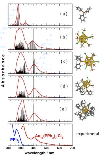 In particular, accurate calculations of the excited electronic states were also performed on ligand-protected Au11 nanoclusters to try to understand whether the observed absorption bands are due to charge transfer or stacking interactions between ligand and metal. It has been shown that the transitions are mainly due to localized states on the gold core, while the ligands have very secondary effects [24]. This is illustrated in Figure 3: the TD-DFT spectra of the PPh3 ligands (panel a) are very different from those of the core Au11 (panel b), while all these models (panels c, d, e) are very similar to each other. The simplest model (panel b), without the organic part of the ligands, is already by itself able to reproduce the experimental spectrum (panel f) with acceptable accuracy, demonstrating that the role played by organic ligands can be considered negligible.