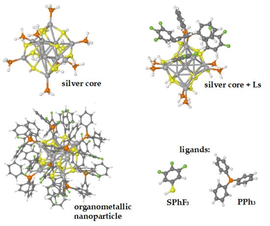 Anyway, organometallic nanoparticles can also have typically molecular optical properties such as the emission of fluorescence [8,9], with potential applications in both optoelectronics and biomedicine [10,11,12,13], especially when the metal core is composed of gold and/or silver atoms. The organic ligands interacting with the metal cores may play an important role in determining not just the three-dimensional structures of metal nanoclusters but also their electronic behavior [14,15]. Consequently, investigating the effect of the organic ligands on the structural stabilization of the metal nanoclusters is a prerequisite to understand their optical properties. The developments in quantum chemistry now allow study of these systems and predicting or interpreting experimental data that would otherwise be difficult to rationalize and understand [16,17].