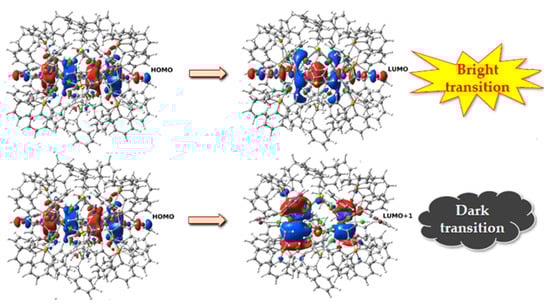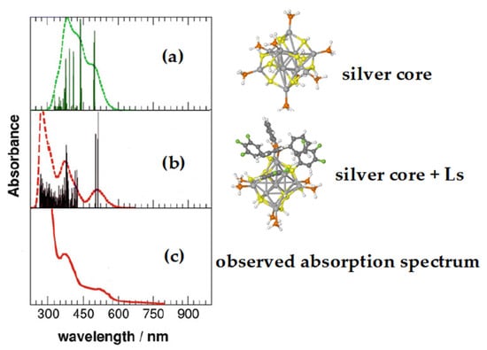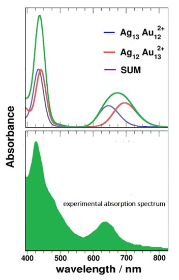 Furthermore, since product II is actually a mixture, its experimental absorption spectrum can be approximated by summing the absorption spectra calculated with n = 13, 12 (with central atom of silver), as shown in Figure 8. This computational prediction has been subsequent verified by ultrafast spectroscopic experiments [31], thus confirming the significance and efficacy of this TD-DFT approach.