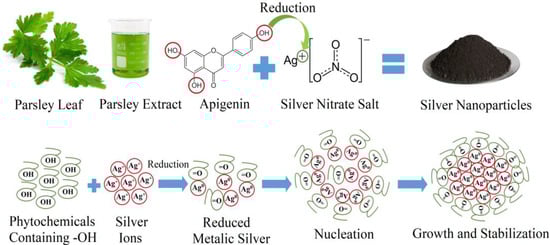 The available phytochemicals in parsley extract reduce the available metal ion in the silver nitrate salt to metal zero nanoparticles. Therefore, plant extract, at the same time, acts as a reducing and stabilizing agent. Makarov et al. [] suggested that metal atoms would be compressed as organic casing in three steps for their degree of steadiness after reduction by plant extracts. Metal ion reduction and nucleation of the reduced metal atom would be in the activation phase, the NPs steadiness improved through the growth phase, and the shape of the NPs formed during the end phase. UV-Vis spectroscopy observes this reaction growth. The UV-Vis spectroscopy revealed an absorption peak, associated with the surface plasmon resonance (SPR), gathers conduction band electrons oscillations in responding with electromagnetic waves, demonstrating metal ion reduction and NPs formation []. Parsley leaf extract comprises flavonoids, polyphenols, carotenoids, lipids, polysaccharides, tannins, free organic acids, and essential oils (Figure 3), which are considered essential bio-reducing and stabilizing agents through possessing -OH groups for NPs formation [,]. Flavonoids and polyphenols are predominant compounds of Parsley []. These phytochemicals, being antioxidant and free from toxic chemicals, are tremendously able to reduce metal ions and stabilizing them in nanoscale length. These phytochemicals are also directly affecting the shape and size of the biosynthesized NPs [].