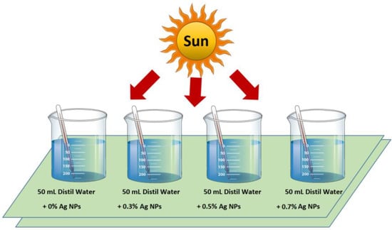 After the synthesis and characterization of Ag NPs by a green method using parsley extract, the NPs were utilized to increase the water temperature. A representation diagram of the present study is shown in Figure 2. The system contains four equalized bakers filled with 50 mL of distilled water.