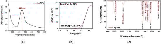 Once the frequency of the electromagnetic field turns out to be resonant with the coherent electron motion, a robust absorption is created, which is the starting point of the observed color whose absorption extremely relying on particle size, dielectric medium, and the environments []. The UV-Vis absorption spectrum (Figure 5a) indicator of the creation of silver nanoparticles is at the visible range of 440 nm, while if we take the UV-Vis absorption spectra of silver nitrate, Ag (NO3), solutions, the absorption peaks will appear around 310 nm due to the existence of nitrate ions in the solution []. At the same time, in the Ag NPs case, both the conduction and valence bands would have lie down very nearby to each other, allowing the free flow of electrons that might have consequently given rise to the surface plasmon resonance (SPR) absorption band as demonstrated by Yallappa et al. [], Ashraf et al. [], and Devaraj et al. []. Moreover, the long tail, precisely at the long wavelengths, is a good indicator for having a tiny extent of aggregated particles, as reported by Hamedi et al. [] and demonstrated in the investigation that the solution comprising NPs persisted unchanging for more than one month, with no indicator of aggregation or precipitation displaying the SPR peak at the equivalent wavelength []. Additionally, agglomeration is always the case, especially in the plant-mediated NPs synthesis, since the presence of biomolecules, particularly proteins, can easily modify the NP surface properties, leading to the loss of colloidal stability and formation of agglomerates. The absence of any additional peak in the UV-Vis spectrum is a good indicator of the purity of the biosynthesized Ag NPs. The results of this investigation agree with the previous studies, showing that the SPR peak for the spherical Ag NPs normally appears between 410 and 480 nm [,,,,].