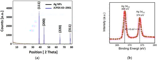 Figure 6a shows the X-ray diffraction (XRD) pattern of the biosynthesized Ag NPs. This pattern confirmed the crystallinity of the Ag NPs. The peaks at 38.01°, 44.34°, 65.52°, and 77.30° are equivalent to (hkl) planes of (111), (200), (220), and (311) planes, respectively. These peaks can be accredited to the face-centered cubic structure of silver nanocrystals, and they are in outstanding agreement with the previous studies [,]. It can be seen from Figure 6a that the diffraction pattern has been matched with JCPDS card No. 65–2901and all the diffraction peaks were indexed to a pure cubic Ag phase. In addition, there are no additional peaks observed in the XRD patterns indicating the high purity of the Ag NPs synthesized by parsley extract. This is a good indicator that plant extract, in contrary to other synthesizing methods, produces pure, high-quality, and stable NPs []. Furthermore, the purity of the sample has been proven by SEM and EDX analysis in the coming sections. The crystallite size and quality can be studied by investigating the full width at half maximum (FWHM) values from the XRD spectrum. Therefore, from the XRD spectrum, one can compute the average crystallite size using Debye–Scherer Equation (1) []: