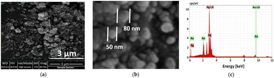 Elemental analysis of the biosynthesized Ag NPs (Figure 7c) was investigated by Energy Dispersive X-ray (EDX) analysis. EDX spectra show a strong signal in the silver region, i.e., 3 keV, and confirm the formation of nanosilver and its elemental nature. This signal was shaped due to the excitation of surface plasmon resonance of Ag NPs. Some of the weak signals from Au were detected. These signals were formed owing to coating the Ag NPs with a 200 Å layer of gold to enhance the quality of the SEM images. Figure 7c shows the purity of the biosynthesized Ag NPs, which contains only an Ag element with no impurity from the other elements. Comparable analysis has been found by previous investigations [].