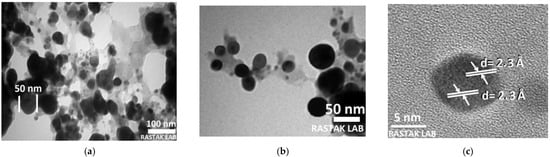 To understand the impacts of the biosynthesis circumstances on the shape and size of Ag NPs, the morphology was investigated using transmission electron microscopy (TEM). Figure 8 displays the existence of spherical Ag NPs. TEM image shows an NPs size range from 40 to 60 nm. High-resolution TEM (HRTEM) study was utilized to find the structure of the biosynthesized Ag NPs. HRTEM displays the crystalline structure of single Ag NP, with noticeable lattice fringes. A lattice spacing of 2.3 Å was computed, equivalent to the Miller index plane (111) of face-centered cubic (FCC) Ag. The TEM images, similarly, revealed that the Ag NPs are monodispersed and highly crystalline, which is in good agreement with the SPR band in the UV-Vis and XRD spectra. It can be seen from Figure 8 that especially under close observation, the biosynthesized Ag NPs are surrounded by shaded layers of foreign matter, which most likely represent the capping agent from the parsley leaf extract. Additionally, the Ag NPs are separated from each other by a uniform interparticle distance. The results of HRTEM are in excellent agreement with an earlier investigation by Alahmad et al. [].