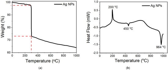 It is well-known that in many applications, such as the current applications in this study, the thermal properties of nanoscale materials are extremely important. The impact of temperature in nanoscale materials has been studied widely, such as crystallization, melting, and decomposition points []. The purity and thermal stability of the biosynthesized Ag NPs were investigated using thermal gravimetric analysis (TGA) and differential scanning calorimetry (DSC) analysis (Figure 9). It can be noticed from Figure 9a that the first loss in mass of about 3% is related to the water desorption from the organic environment of the NPs, while the second loss in mass of about 27% demonstrated that the metallic core, Ag NPs, is enclosed by biomolecules. These outcomes agree in a high manner with the HRTEM results; it has been shown that the shaded layers are representing the capping agents surrounded around the Ag NPs. At the same time, these results solve the dilemma of stability of the available phytochemical inside the plant extracts, which are stable until high temperature []. In addition, TGA analysis (Figure 9a) proposed that the weight loss in the temperature range of 0 °C−100 °C is due to the water desorption from the organic environment of the NPs. This, in turn, proves that the biosynthesized Ag NPs are a good candidate for absorbing moisture in many areas of applications []. From Figure 9b, a sharp exothermic peak at 200 °C could be observed together with two small endothermic peaks, one at 450 °C and the other one at 964 °C (Figure 9b) analogous to the melting point of the metallic silver, which specifies the purity of the NPs. The deprivation pattern of organic compounds was lasting until 750 °C. In other words, there was no deprivation above 750 °C, which is related to the weight of Ag NPs. Analogous consequences have been found elsewhere by other researchers [,].