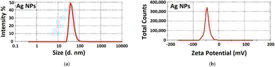 The dynamic light scattering (DLS) is utilized to compute the diameter of the Ag NPs dispersed in the liquid. The size dissemination profile of the biosynthesized silver nanoparticles measured by the DLS method is shown in Figure 10. The sharp signal confirms the equi-size particle distribution, an indicator for monodispersity, which agrees well with the UV–Vis spectrum. Size distribution profiles reveal one population of NPs with an average size around 55 nm. Zeta potential, in turn, is the degree of the actual electric charge around the surface of the NPs. Once a nanoparticle possesses a total surface charge, the charge is measured through the ion concentration within an opposite charge near the surface of the NPs []. The zeta potential value was shown to be −50 mV, which is corresponding to the high stability of the biosynthesized Ag NPs. These outcomes are in good agreement with Netala et al.’s results []. The DLS results coinciding with the range obtained from the HRTEM analyses. Consequently, the DLS and TEM analyses provided analogous results for the size range of the NPs. Parsley leaf extract mediated biosynthesized Ag NPs possess high negative zeta potential values, and thus, they are stable under a wide pH range [].