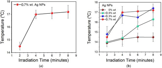 Figure 12a shows temperature profiles of 0.7% wt. Ag NPs in water medium by heat generation due to SPR of free electrons when exposed to the sunlight. It can be noticed that the heat released by the Ag nanofluid under sunlight irradiation at the plasmonic-resonant wavelength increased the temperature of the water medium as the irradiation time increases []. In order to achieve an optimal plasmonic heating generation, the wavelength of the light source should be close to the plasmonic resonance wavelength of Ag NPs []. It can be seen from Figure 12b that the released heat by the Ag nanofluid under sunlight irradiation at the plasmonic-resonant wavelength increased the temperature of the water medium as the irradiation time increased. Additionally, the concentration of Ag NPs has a noticeable effect on increasing the water temperature. For instance, at a low concentration of Ag NPs (0.3%), the temperature of the water rises up to 17.4 °C after 8 min, while the temperature profiles containing between 0.5% and 0.7% of Ag NPs were reached at 16.3 and 17.2 °C, respectively. As a result of the absorption, trapping, and scattering of the incident light by the Ag NPs over a board spectrum is following the generation of heat through non-radiative damping after sunlight absorption, as explained in Figure 11 [].