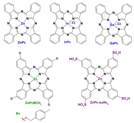 - Lo, P.C.; Rodríguez-Morgade, M.S.; Pandey, R.K.; Ng, D.K.P.; Torres, T.; Dumoulin, F. The unique features and promises of phthalocyanines as advanced photosensitisers for photodynamic therapy of cancer. Chem. Soc. Rev. 2020, 49, 1041–1056. [Google Scholar] [CrossRef]