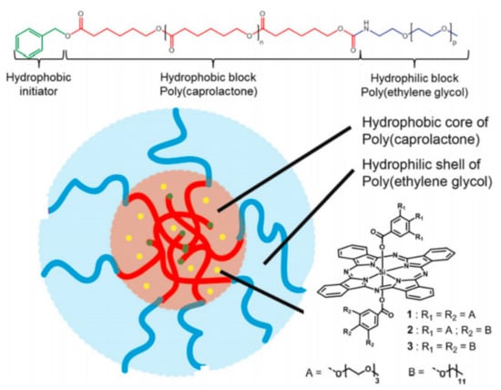 - Rijcken, C.J.F.; Hofman, J.-W.; van Zeeland, F.; Hennink, W.E.; van Nostrum, C.F. Photosensitiser-loaded biodegradable polymeric micelles: Preparation, characterisation and in vitro PDT efficacy. J. Control. Release 2007, 124, 144–153. [Google Scholar] [CrossRef] [PubMed]