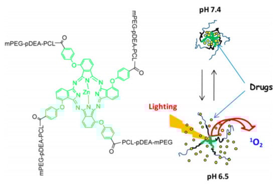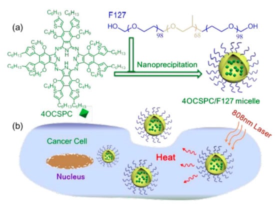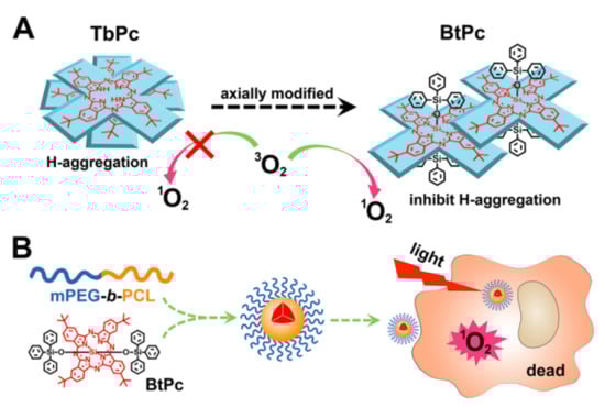 - Jing, C.; Wang, R.; Ou, H.; Li, A.; An, Y.; Guo, S.; Shi, L. Axial modification inhibited H-aggregation of phthalocyanines in polymeric micelles for enhanced PDT efficacy. Chem. Commun. 2018, 54, 3985–3988. [Google Scholar] [CrossRef] [PubMed]