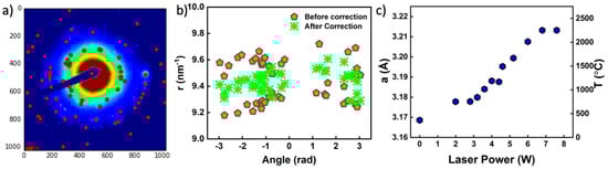 (a) Example colorized electron diffraction pattern obtained from tungsten showing He location of diffraction spots identified by a custom python code. (b) Uncorrected and corrected positions of diffraction spots associated with a set of reflections. (c) Plot of the calculated lattice parameter as a function of applied laser power.