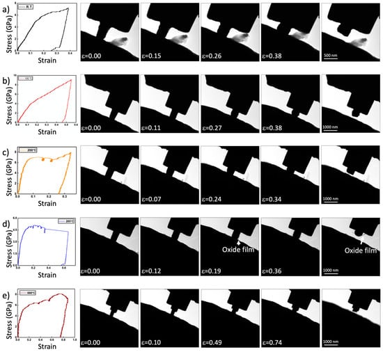 A series of nanopillar compression experiments performed at (a) room temperature, (b) 100 °C, (c) 200 °C, (d) 285 °C, and (e) 660 °C. including time-lapse images and stress–strain curves. Of note is the observation of a thin scale debonding from the tungsten pillar while testing at 285 °C.