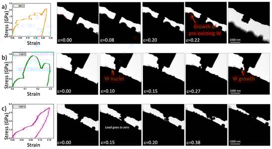 A series of nanopillar compression experiments performed at different temperatures between 850 °C and 1250 °C including time-lapse images and stress–strain curves. At 850 °C, shear is observed in the pillar along with some growth of tungsten particles that pre-existed on the surface of the YSZ indenter. Experiments performed at 850 °C demonstrate the nucleation and growth of tungsten particles on the YSZ indenter as the pillar is compressed. At 1250 °C, the pillar undergoes initial loading but begins reacting rapidly. The load returns to zero as the pillar continues to react. The samples in this figure were tested sequencially (b), followed by (c) and then (a), which accounts for W particles existing on the indenter surface prior to loading.