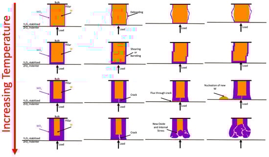 Figure 4 schematically depicts the proposed evolution of the samples during mechanical testing at different temperatures. As temperature increases, the effect of surface oxidations becomes an increasingly important factor in determining the deformation modes active in the pillars. At low temperatures, the thin oxidation scales are hypothesized to only weakly affect mechanical properties and deformation modes. For example, the decohesion of the thin scale observed at 285 °C appears to have little impact on the mechanical properties. At higher temperatures, the constraint of the oxidation product appears to drive long-range diffusional transport in response to the applied load, i.e., creep. For example, deformation at 1120 °C occurred via the removal of tungsten from the pillar and its redeposition on the YSZ indenter. The relatively uniform pillar deformation and the formation of relatively spherical deposits suggest the process is diffusional in nature. The delocalized nature of the deformation process is hypothesized to result from the presence of a surface oxidation product. The presence of an oxidation product is visible in ex situ SEM characterization of the pillars. The composition of this surface reaction product was not determined directly. Related experiments performed in this same microscope at elevated temperatures, for example, have characterized the oxidation of metals in detail [27]. Common vacuum impurities, H2, CO, CO2, O2, N2, H2O, and hydrocarbons, are most likely to form tungsten oxides, nitrides, or carbides, given the relative instability of tungsten carbontes. Tungsten carbides and nitrides, however, are susceptible to oxidation are relatively low oxygen partial pressures. The mechanism associated with long range mass transport is proposed to be analogous to whisker growth mechanisms that are relevant to the formation of both whiskers and nodular features in alloys [35,36].