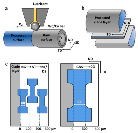 The material utilized for SMRT processing is a polycrystalline Ni alloy with a nominal composition of 22.7 Cr, 13.8 W, 1.05 Mo, 1.01 Fe, 0.94 Co, 0.44 Al, 0.42 Mn, 0.38 Si, 0.08 C, and Ni in bal. (in wt.%). The alloy sample was cut into cylinders with a diameter of 10 mm and a length of 160 mm, and then homogenized at 1222 °C for 1 h followed by water-quenching. A homogeneous CG microstructure with an average grain size of ~110 μm was achieved. In the SMRT processing (Figure 1a), the as-received Ni alloy rod rotated at a velocity of v1 with respect to a WC/Co alloy ball, which was enforced into the rod surface with a nominal penetration depth of 20 μm. Meanwhile, the WC/Co alloy ball displaced along the transversal direction (TD) (i.e., longitudinal axis of rod) from one end to the other with a velocity of v2. Liquid lubricating oil was fed between the WC/Co ball and rod as a coolant to reduce the transient temperature rise associated with the localized plastic deformation. In order to facilitate the micro tensile tests at various depths, the SMRT process was repeated eight times with the same procedure to maximize the thickness of the gradient-nanostructured layer.