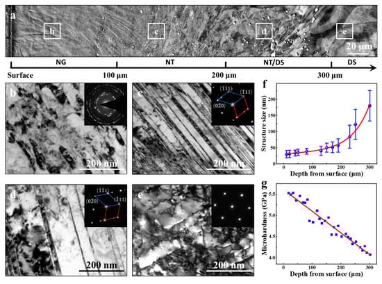 Figure 2a shows a representative cross-sectional SEM image of the SMRT sample, showing varied microstructural features with increasing the distance to the surface. In the region from the surface to ~100 μm in depth, the deformation layer exhibits a uniform contrast, and the original coarse-grained grain boundaries (GBs) are not distinguishable, indicating a significant grain refinement due to the large strain and strain rate exerted on the surface [,,,]. In the depth region of 100–300 μm, the microstructure is characterized by a high density of planar defects, which tend to comply with the shear direction. The density of the planar defects becomes lower with increasing depth. In the region with a distance of >300 μm from the surface, although certain amounts of planar defects within grain interiors remain visible, the original GBs appear to be easily identified. The distinct microstructural features observed at various depths of the SMRT sample indicate a formation of GNS in the depth span of 0–300 μm. The present observations are consistent with previous results obtained in other materials, such as Ni [,,], Cu [,], Al alloy [,], and Ni alloy [,,], subjected to surface mechanical processing.